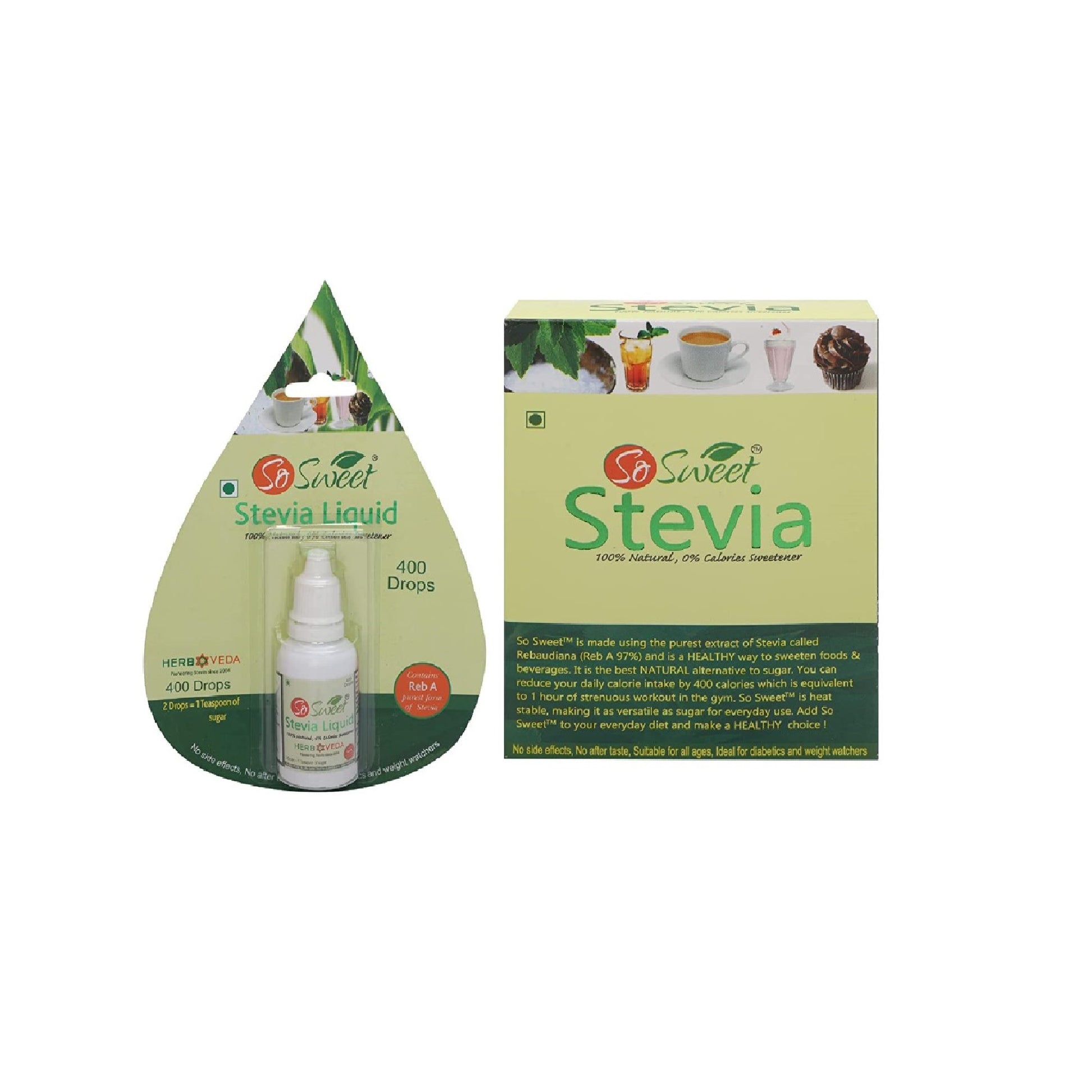 So sweet sachets are easy to use and perfect sugar substitute for daily life. It is a zero calorie sweetener. Add just 1 or 2 sachets in your beverages like tea/coffee/milk and cold beverages like juices and health drink. Stevia can help you cut down calories and is safe for EVERYDAY use. So Sweet Stevia is an ideal sugar substitute for Weight Watchers, Diabetics and Health Conscious people. So Sweet Stevia liquid is 100% Natural Sweetener made using purest extract of stevia Stevia Sugar Free Liquid drops are completely natural sweetener derived from the stevia plant. Diabetics can use stevia because it contains no calories and has no effect on blood sugar levels. It has no bitter aftertaste, so it can be used to add the perfect amount of sweetness.