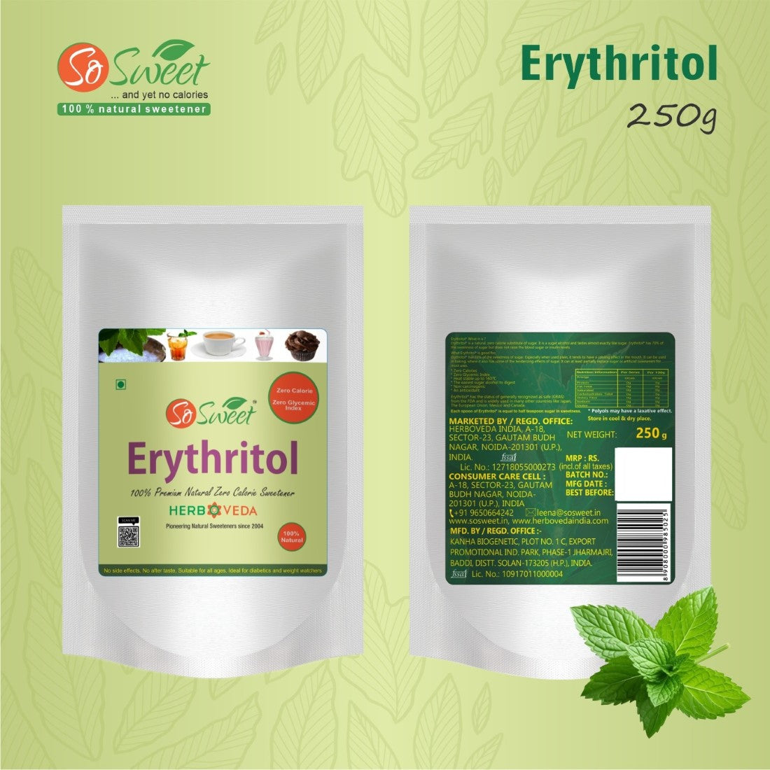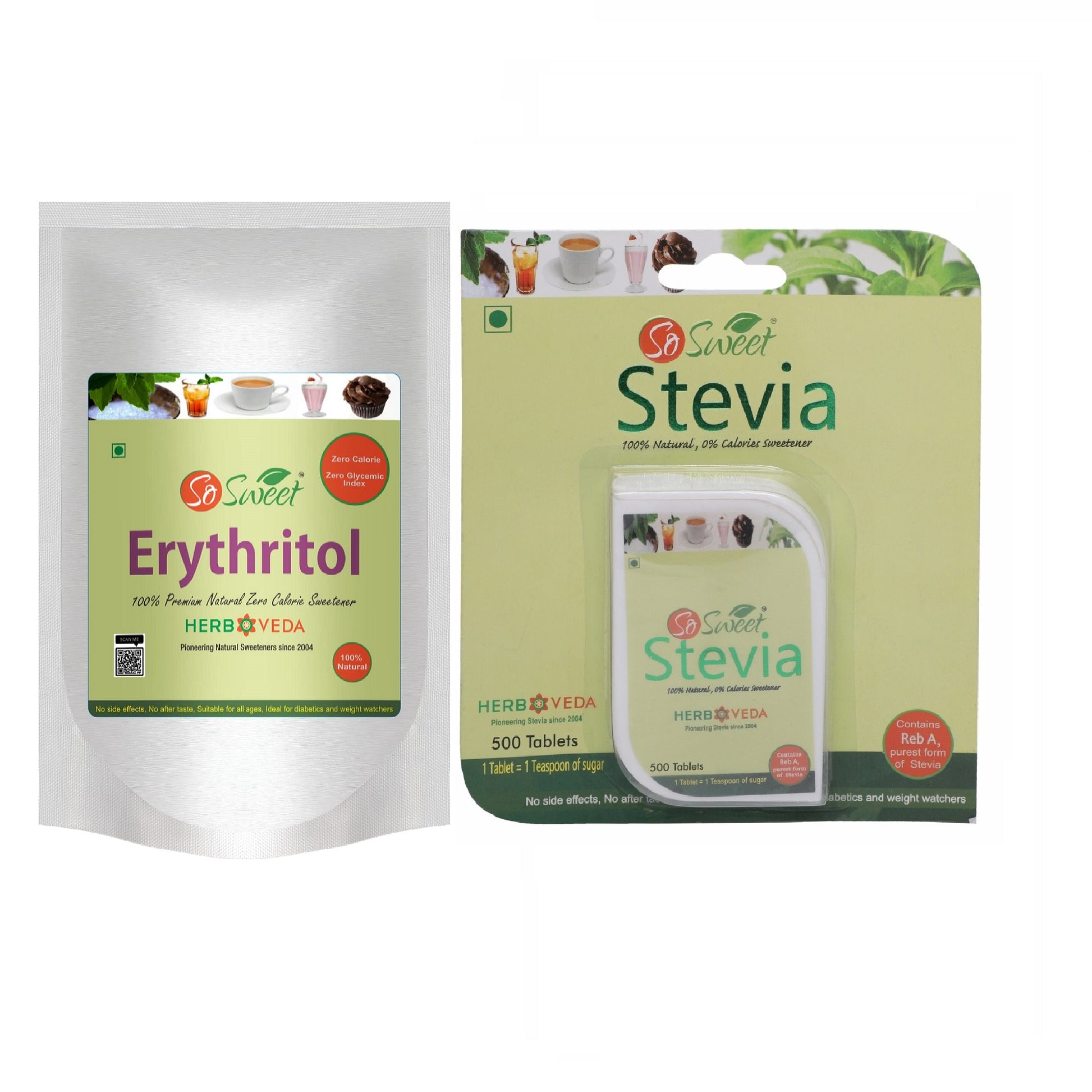 So Sweet Stevia Tablets are 100% Natural Sweetener with Zero Calories here to make your life sweeter without compromising your health . Stevia Sugar Free Tablet is a completely natural sweetener derived from the stevia plant. Diabetics can use stevia because it contains no calories and has no effect on blood sugar levels. It has no bitter aftertaste, so it can be used to add the perfect amount of sweetness. It checks all the health boxes because it is a Zero calorie and diabetic friendly, has no added sugar . Erythritol is a natural zero-calorie substitute of sugar. It is a sugar alcohol and tastes almost exactly like sugar. Erythritol has 70% of the sweetness of sugar but does not raise blood sugar or insulin levels. Erythritol has 70% of the sweetness of sugar. Especially when used plain, it tends to have a cooling effect in the mouth. It can be used in baking where it also has some of the tenderizing effects of sugar. It can at least partially replace sugar or artificial sweeteners for most uses .