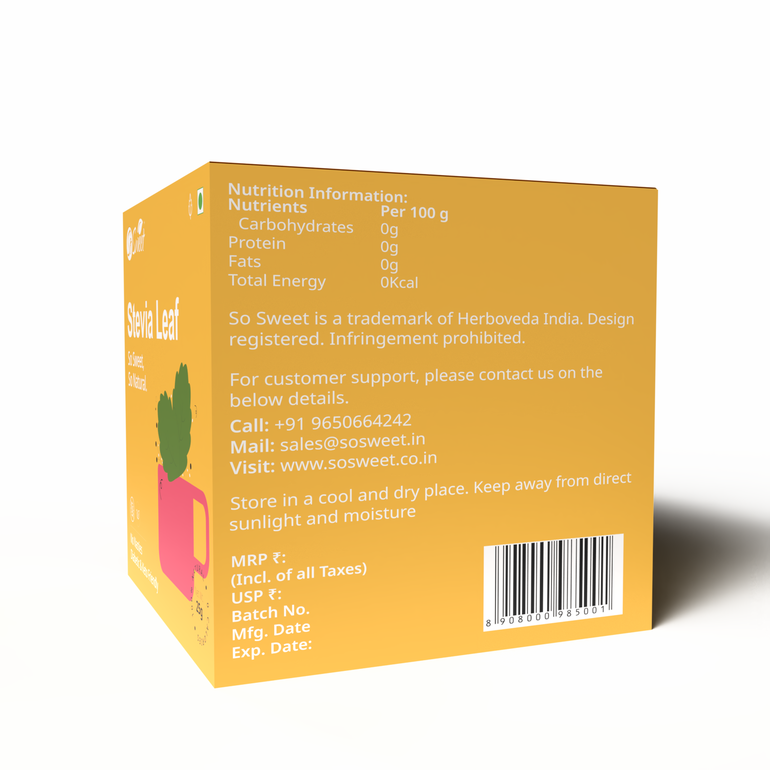 So Sweet Stevia Natural Sweetener with Zero Calories is here to make your life sweeter without compromising your health So Sweet Stevia is a completely natural sweetener derived from the stevia plant. Diabetics can use stevia because it contains no calories and has no effect on blood sugar levels. It has no bitter aftertaste, so it can be used to add the perfect amount of sweetness. It checks all the health boxes because it is vegan-friendly, has no added sugar, and is low in calories Take your smarter approach to sweetness with you wherever you go by keeping your healthy sugar companion with you. So, from now onwards, refrain from subjecting yourself to the ordeal of drinking sugarless tea and coffee. You can use these to your hold and a cold drink. The primary ingredient in these is derived from the stevia plant, which has naturally sweetened leaves So Sweet Stevia is a well-liked sugar replacement that is made from the native stevia plant Stevia rebaudiana. People who want to cut back on calories and sugar in their diet frequently utilize this replacement. People are choosing healthier alternatives to sugar in greater numbers, and Stevia has become a well-liked option, especially among those who have diabetes. The natural, calorie-free sweetener may help to regulate blood sugar levels So eat your favorite food just by replacing your daily sugar with So Sweet Stevia without gaining any weight while you sit! JUST REPLACE YOUR REFINED SUGAR WITH SO SWEET STEVIA AND ENJOY YOUR PIZZA WITH ZERO CALORIES