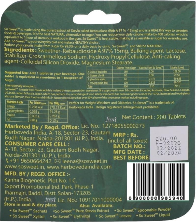 Sweetner-Rebaudioside A97% 15mg, Bulking Agent -Lactose, Stabilizer -Croscarmellose sodium, Hydroxy Propyl Cellulose, Anti -caking agent- colloidal silicon Dioxide, magnesium Stearate.