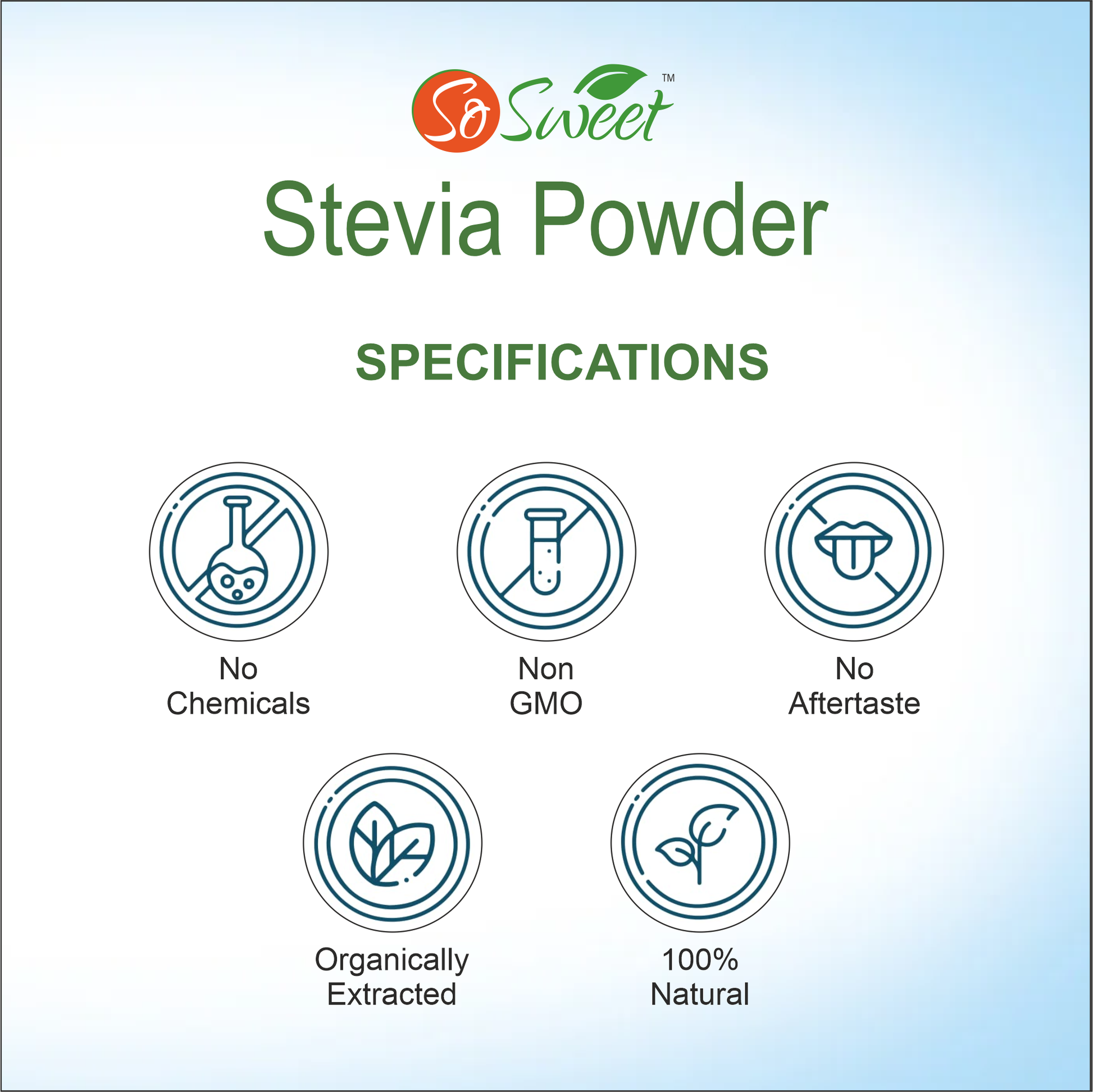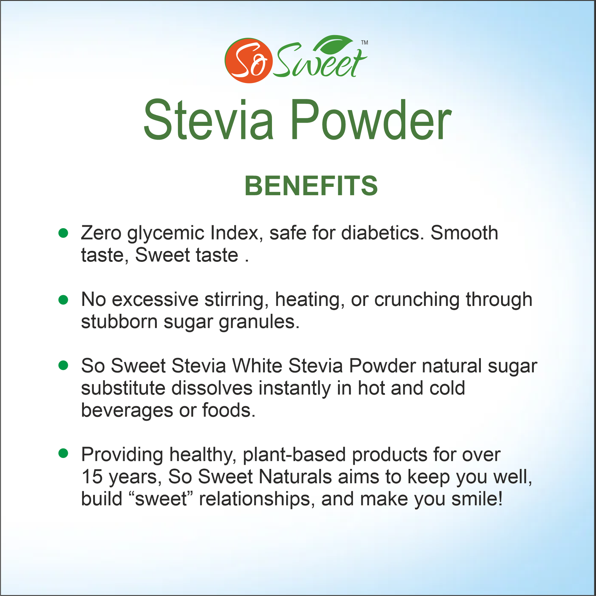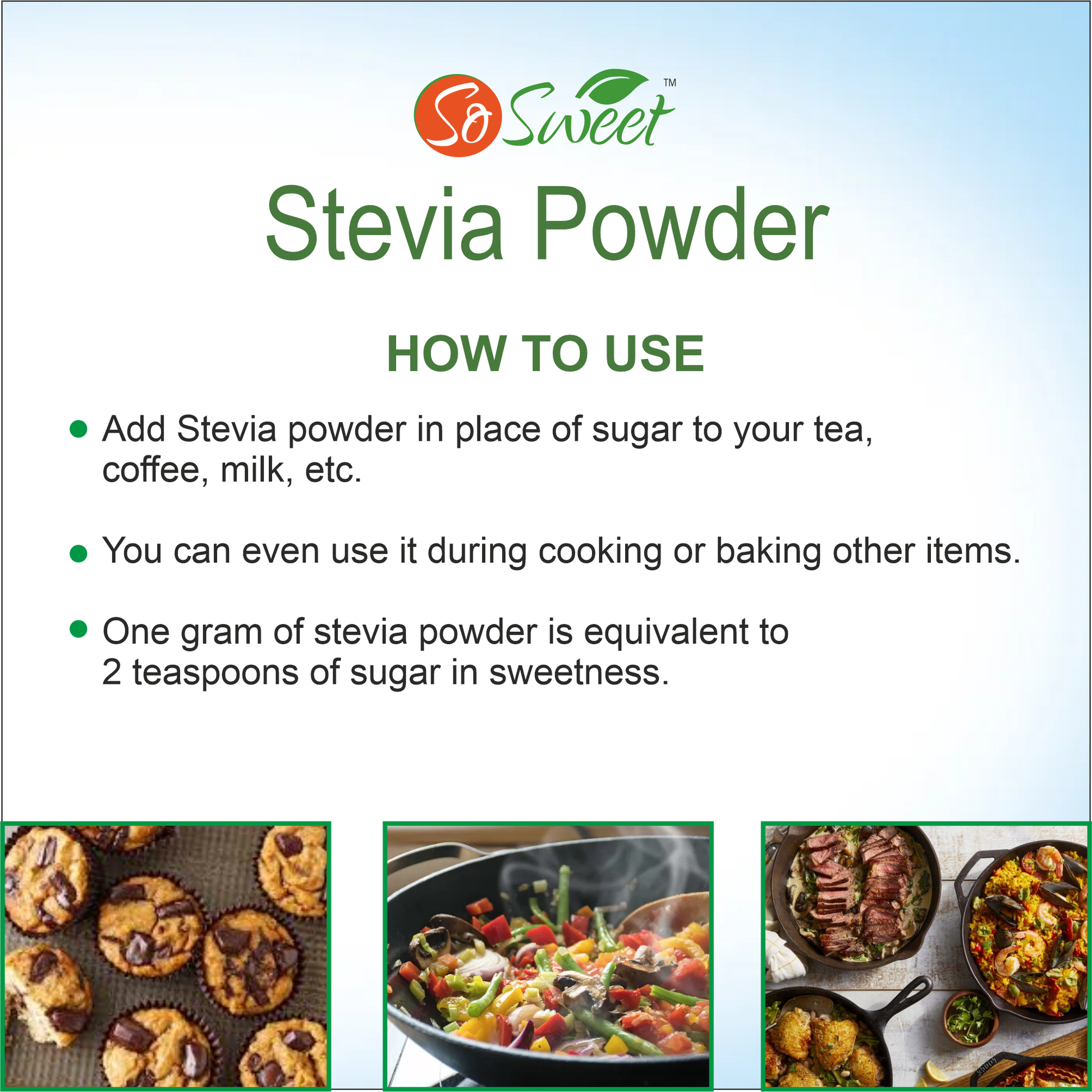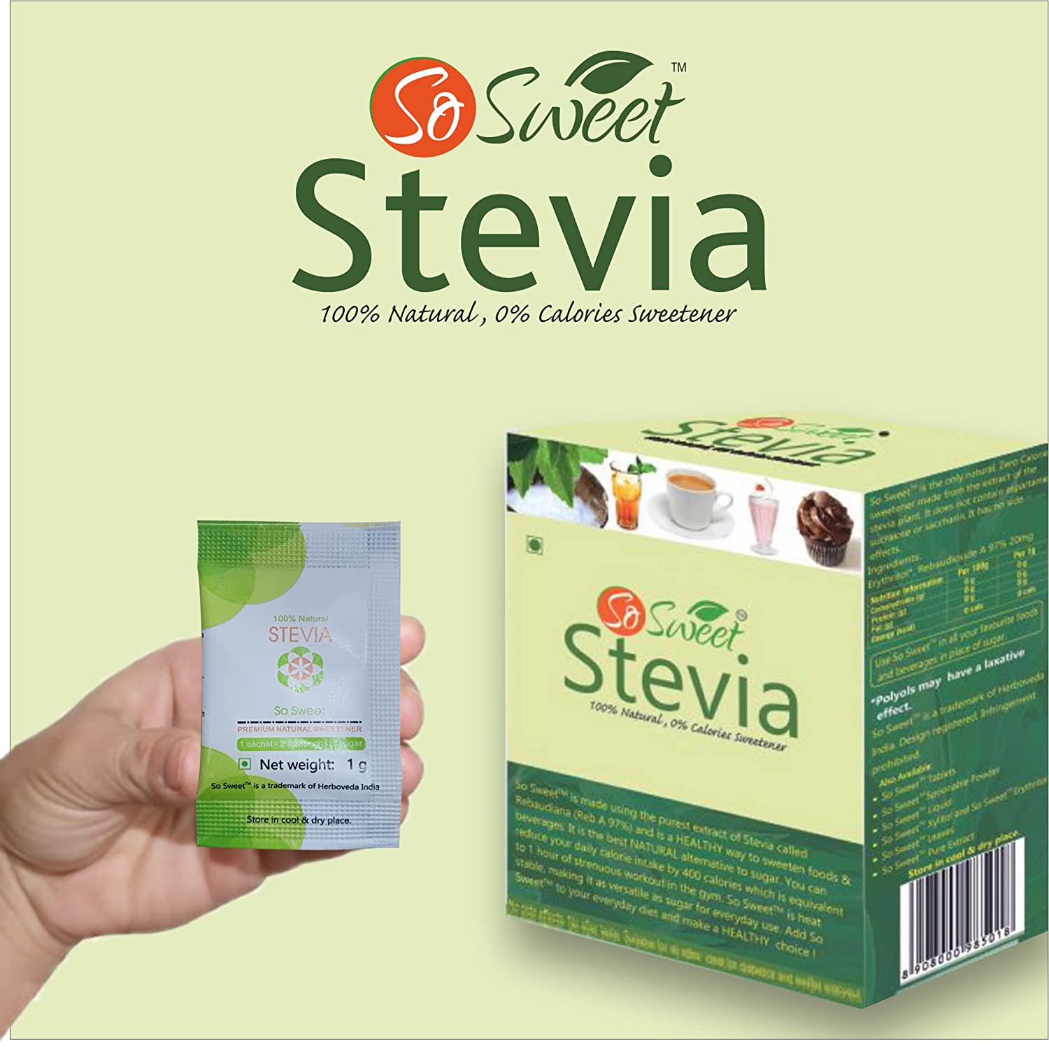 So Sweet Stevia Natural Sweetener with Zero Calories is here to make your life sweeter without compromising your health. So Sweet Stevia is a completely natural sweetener derived from the stevia plant. Diabetics can use stevia because it contains no calories and has no effect on blood sugar levels. It has no bitter aftertaste, so it can be used to add the perfect amount of sweetness. It checks all the health boxes because it is vegan-friendly, has no added sugar, and is low in calories. So sweet sachets are easy to use and perfect sugar substitute for daily life. It is a zero calorie sweetener. Add just 1 or 2 sachets in your beverages like tea/coffee/milk and cold beverages like juices and health drink. Stevia can help you cut down calories and is safe for EVERYDAY use. So Sweet Stevia is an ideal sugar substitute for Weight Watchers, Diabetics and Health Conscious people .